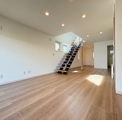 毎日の暮らしが楽しくなる居住空間。明るく開放感あふれるリビングダイニング。キッチン横には食品や日用品をストックできる収納を完備。2階各部屋は2面採光で通風良好で快適空間。玄関には土間暖房を完備。ZEH×都市ガスで省エネに優れ光熱費を抑えられます。外壁にはガルバリウム鋼板を採用。耐久性に優れメンテナンスコストも抑えられます。JR「白石」駅徒歩17分、バス停も徒歩10分以内に2ヵ所あり。