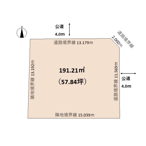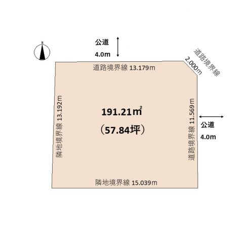 東側4.0m公道に間口11.569m接道、北側4.0m公道に間口13.179m接道